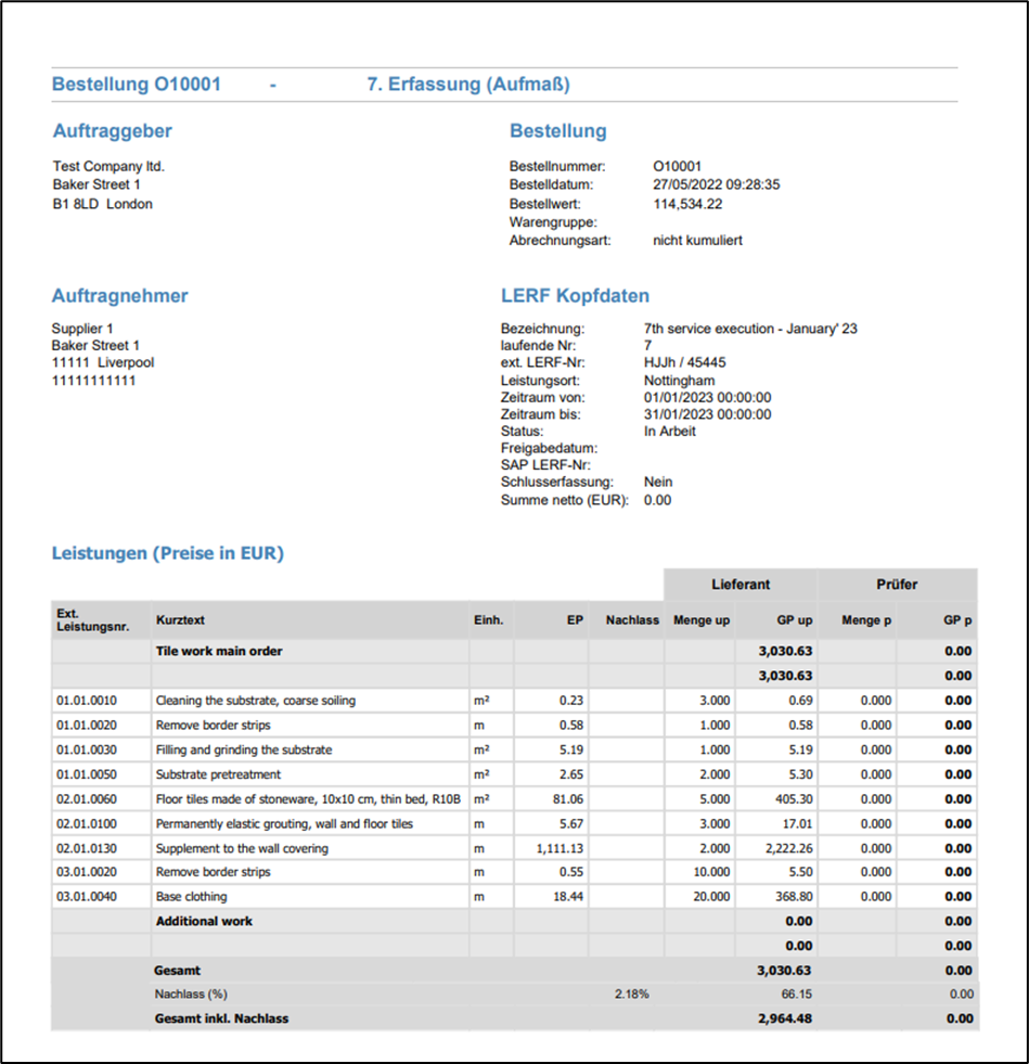 The service entry is displayed in DIN A4 format and can be printed out directly. The layout is given here and cannot be adjusted.