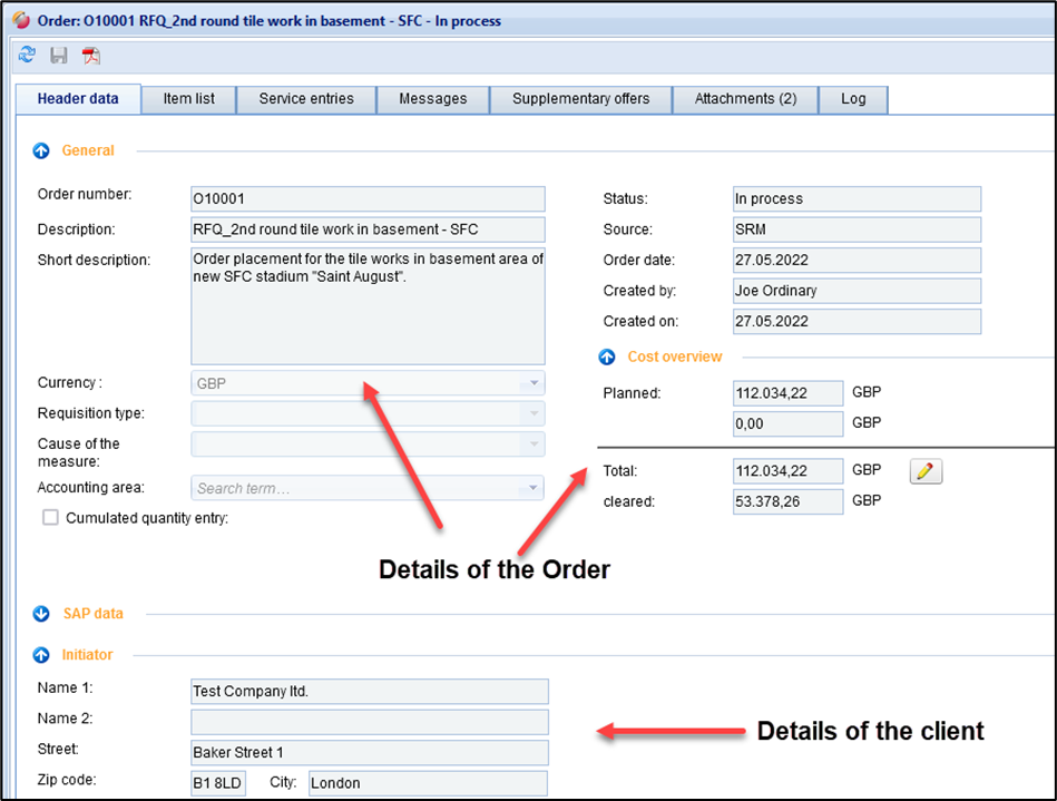 After you have selected an order and opened it with a double-click or the magnifying glass in the button bar at the top, the tab "Header data" opens.