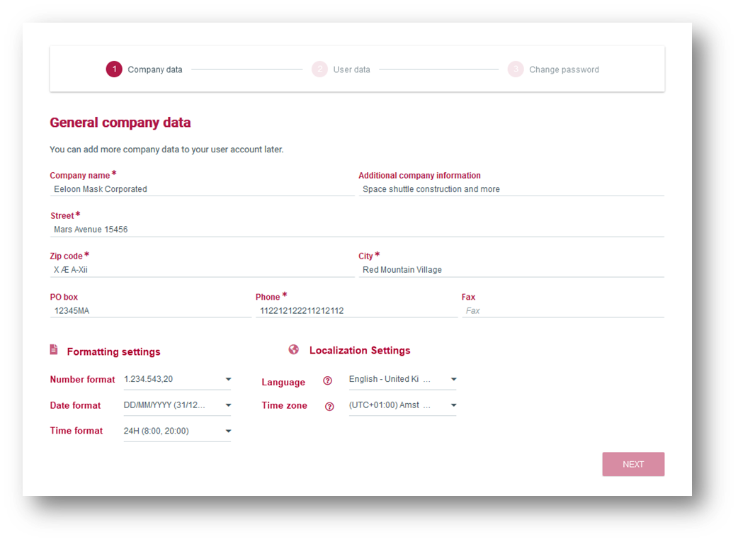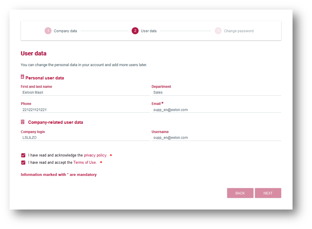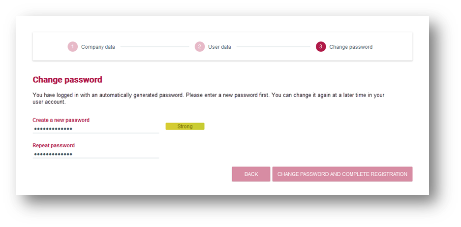 In the case of a newly created company account, it is necessary to first maintain the company data and thus carry out your registration. In the next step, the user account data and has to be adapted. Every user account created afterwards does only have to maintain its personal user data.