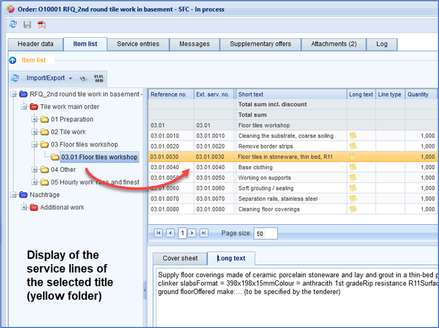 Long text Display of the long text of a service line
