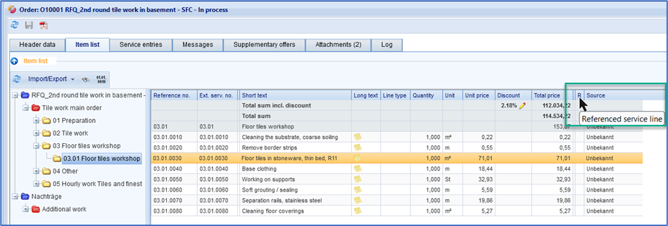 In the "Reference to" column, the service number of the originally commissioned service is displayed in the case of supplementary services. If, for example, there is an increase or decrease in quantities, the supplementary line is shown separately with the increase/reduction. In the following example, the client has submitted an addendum with two supplementary lines. Both addendum lines refer to contracted services whose service number is displayed in the Reference to field.