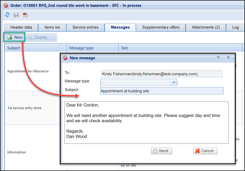 Clicking on "Send" closes the window and sends the message to the recipient by e-mail. In addition, the message is stored in the message list of the purchase order and is visible to suppliers and customer users who have access to this purchase order. The message cannot be adjusted afterwards.