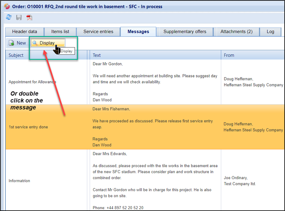 Messages can be created by all users of the purchasing company and the supplier company who have access to the order.