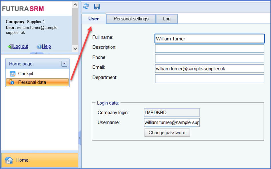 In the Personal Data section, maintain your login data for FUTURA Engineering. The company login is the same for all users of the company and can only be changed in the company data area. Username and password can be adjusted here. Save your changes by clicking on the save button (floppy disc) above.