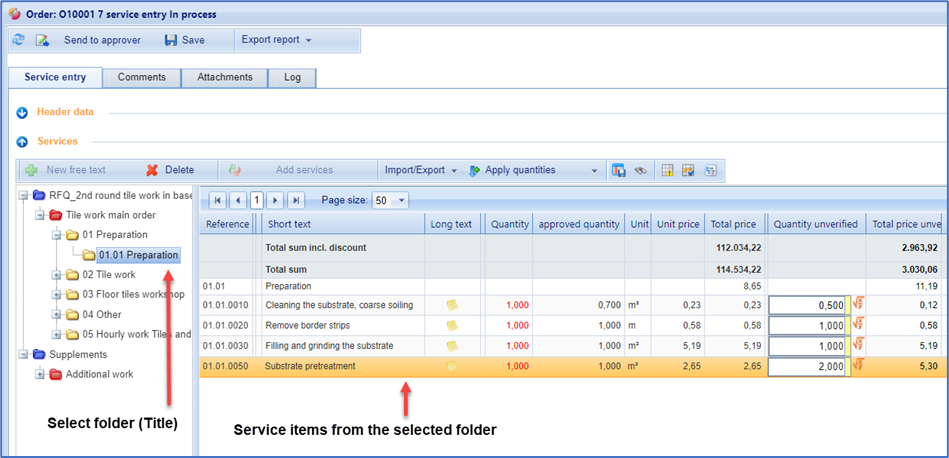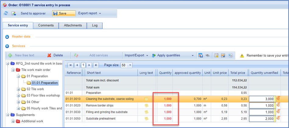 Now maintain your quantities. With the Enter key, the cursor jumps to the next quantity field. This allows you to easily record further services quickly. Save your entries with the "Save" button. After saving, the total price is calculated unverified (Total unverifiied).