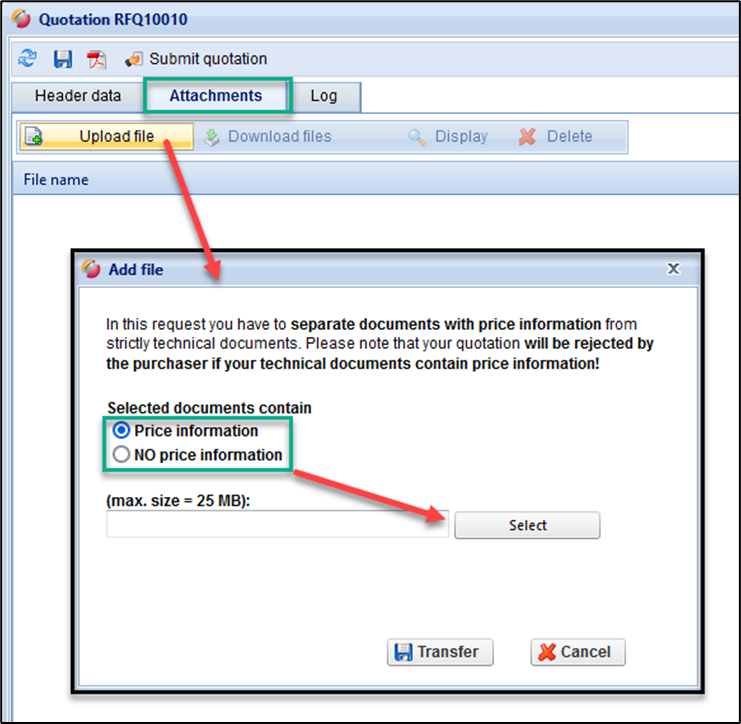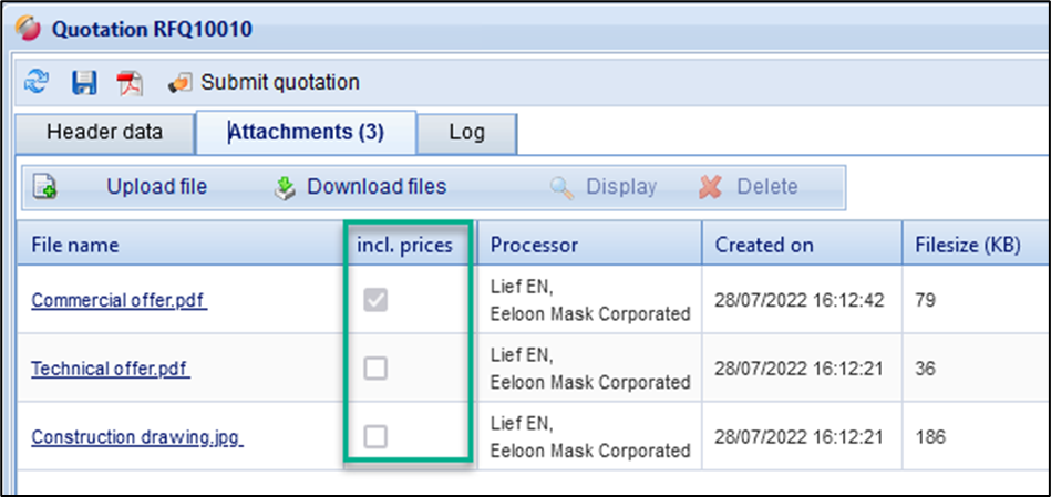 In so-called "multi envelope" requests, in which the client requests technical and commercial quotation documents, you will be stopped by the system when uploading your systems to see if there is information about quotation prices in them. You should make sure that you upload them separately, as the evaluation is carried out separately:
