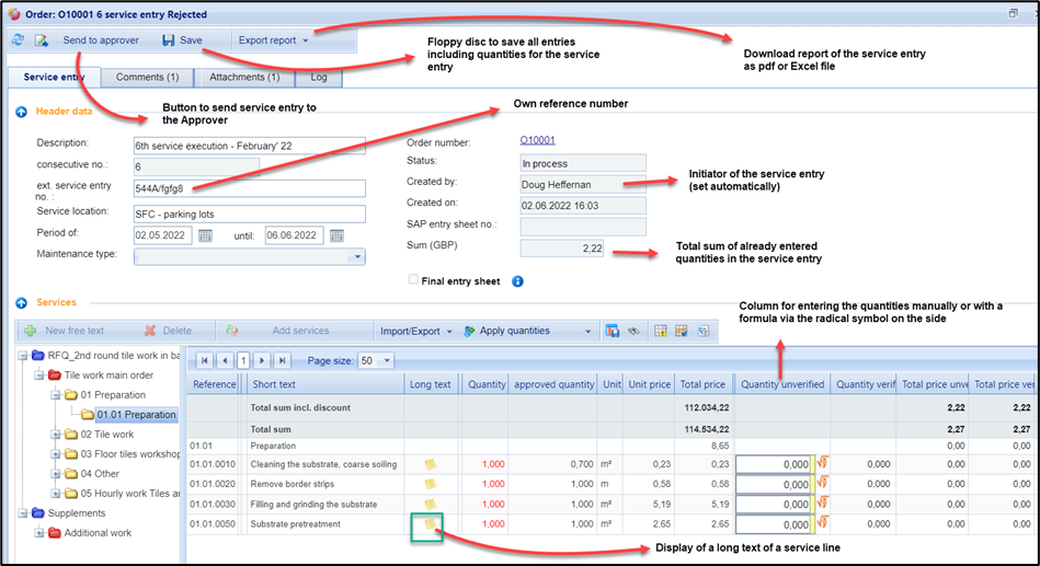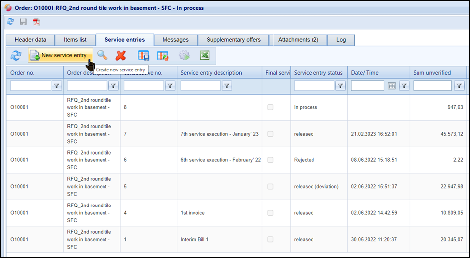 In this short introduction, you will be shown the essentials for creating and sending service entries for an order. More detailed information on this topic can be found in this service portal under the indicated pages.