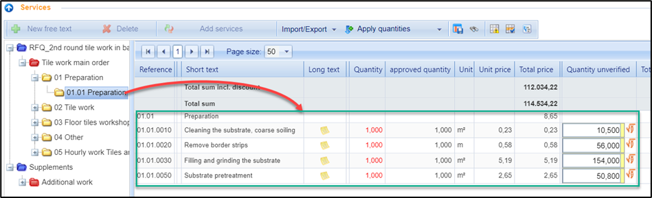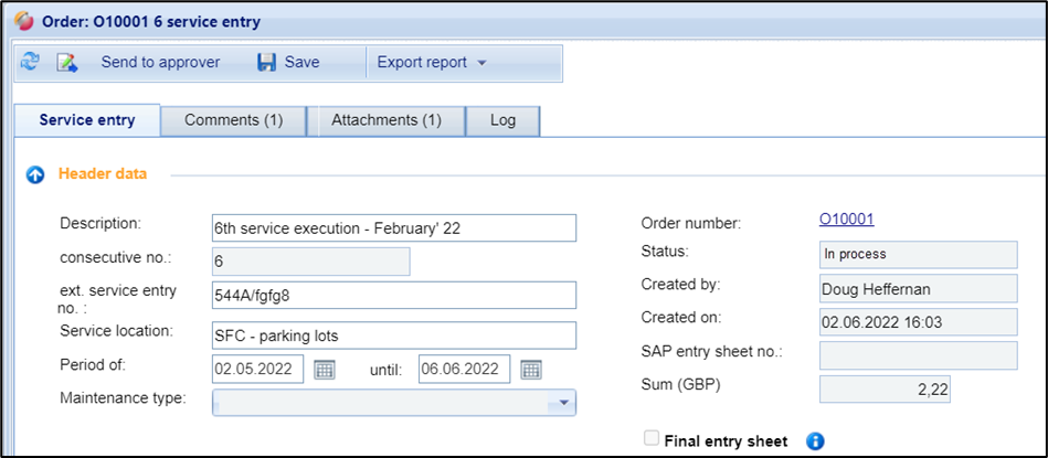 The entry of quantities for service entries must be made either cumulatively or non-cumulative. This is a default setting that the purchaser specifies in the order. The rules for both variants can be found here: Applied rules in the service entry process