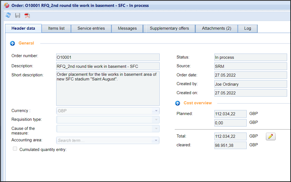 The order is loaded and is displayed divided into different tabs. Structure of an order: