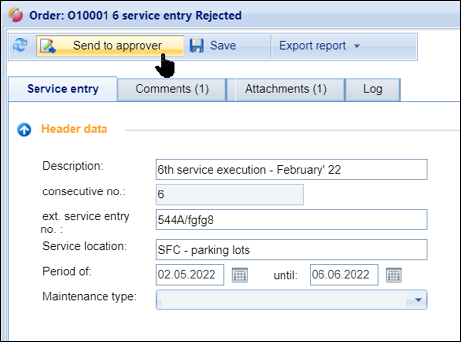 service entries completed by you must be transmitted to the approver for review. Make sure that you have properly recorded all services provided so far. Depending on the settings of your customer, you can specify the approver by yourself to which the service entry is to be sent. To submit the service entry displayed in the selection window, click on the button "Send to approver".