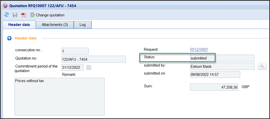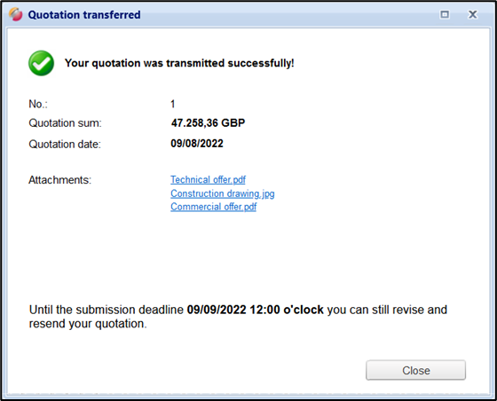 If the quotation has been successfully submitted, the following message appears: