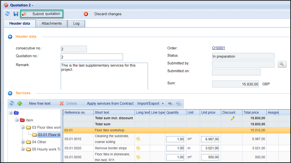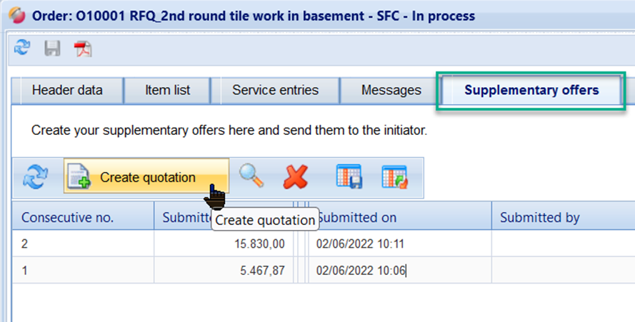 Click on the button “Create quotation” under the tab Supplementary Quotations”.