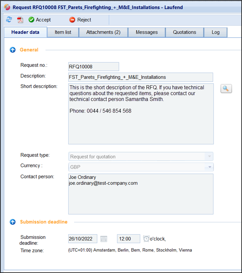 Submission deadline | Date and time After reaching the deadline, the Request ends, the Request changes to the status "Closed" Thereafter, it is no longer possible to submit a quotation |