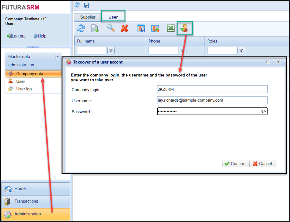 Under “Administration” and “Company Data”, go to the "Users" tab. Then click on the button "Taking over a user account". A dialog box opens in which you can enter the access data of the other company access.
