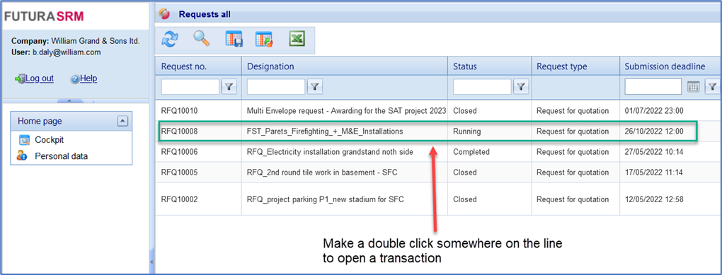 In the "Transactions" menu, you can access and edit your requests and Quotations as well as your orders and service entries. If you select the desired list on the left side, the transactions are displayed in a table on the right.